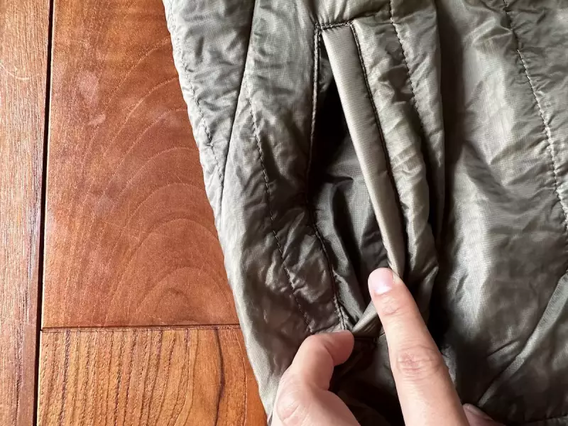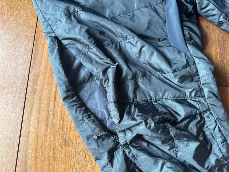 ダウンジャケットや化繊ジャケットと比較すると優れた保温性を備えているとは言えないのですが、軽さ、濡れても安心という点から、シーンを選べば大変便利な保温着として活躍してくれます。ハンドウォーマーポケットはジッパーがないシンプルな作りです。