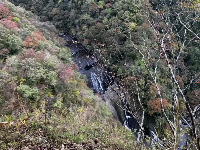 アップダウンの後またしても急降下しますが、尾根道から眼下に袋田の滝が見える「滝のぞき」のスポットがあります。下から見上げればわかりますが、断崖絶壁ですからくれぐれも注意してください。