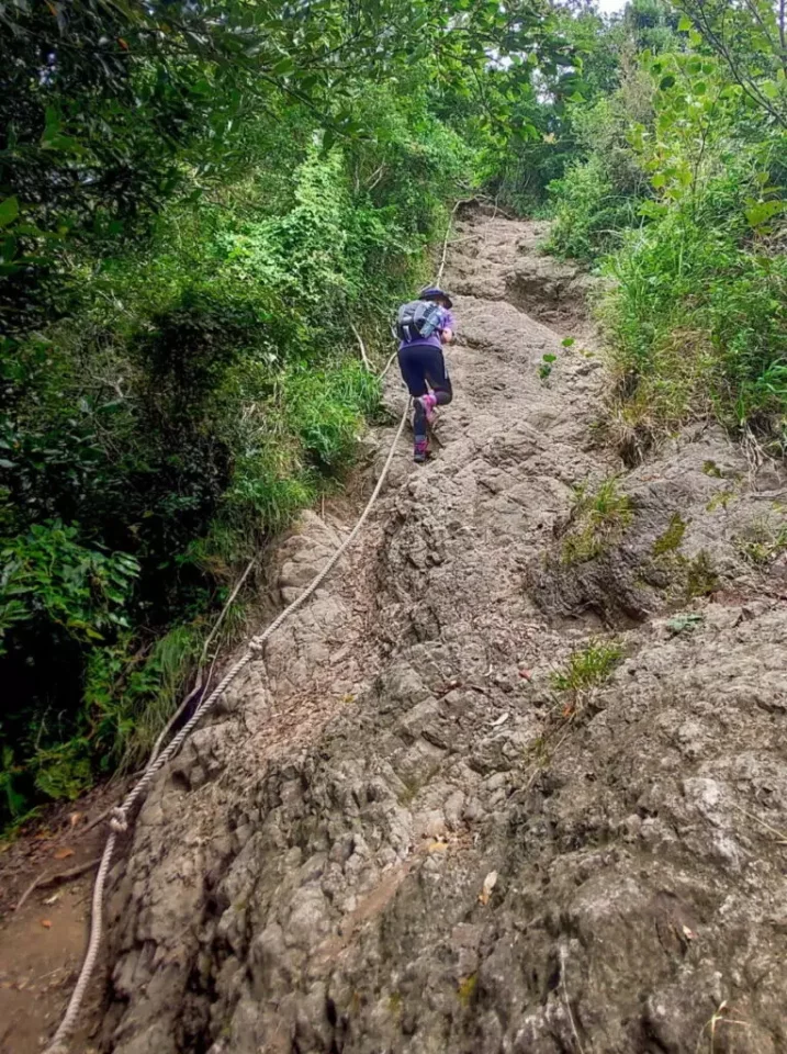 山頂間近になると、それまでの登山道が一変して鎖やロープが設けられた急勾配の岩場に。アドベンチャーが楽しめる人気のポイントですが、マナーを守り、注意深く進んでください。