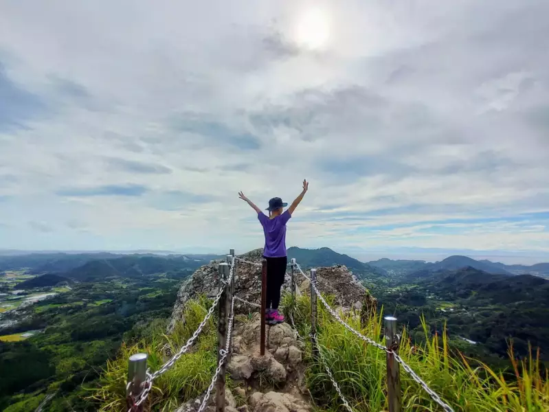 岩を登って辿り着いた山頂からは、低山とは思えないような高度感のある360度の絶景が広がっています。