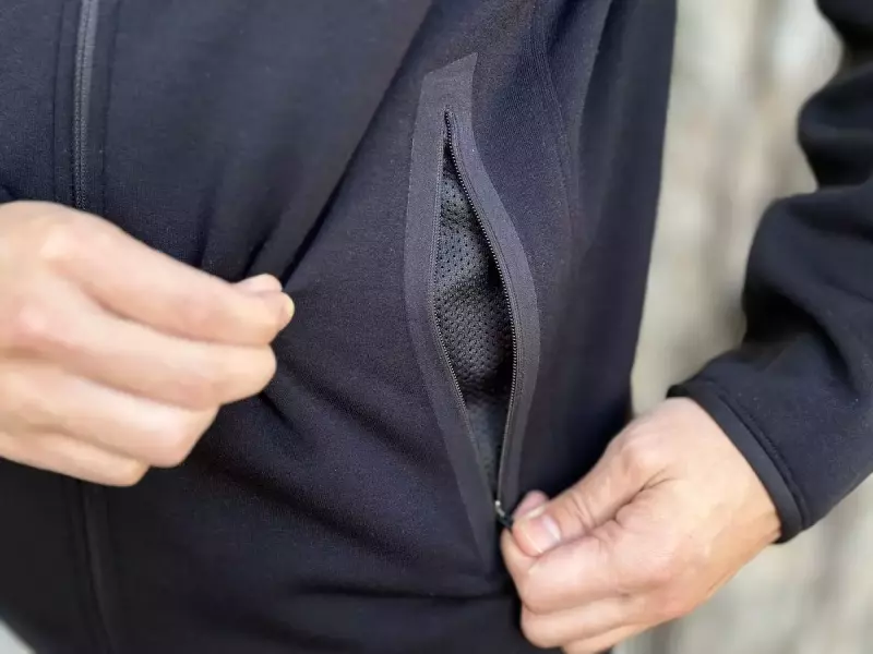 ポケットにはジッパー付きのハンドウォーマーポケットが備わっています。ポケットのジッパーはラミネート加工で取り付けられていて、これが見た目の特徴にもなっています。
