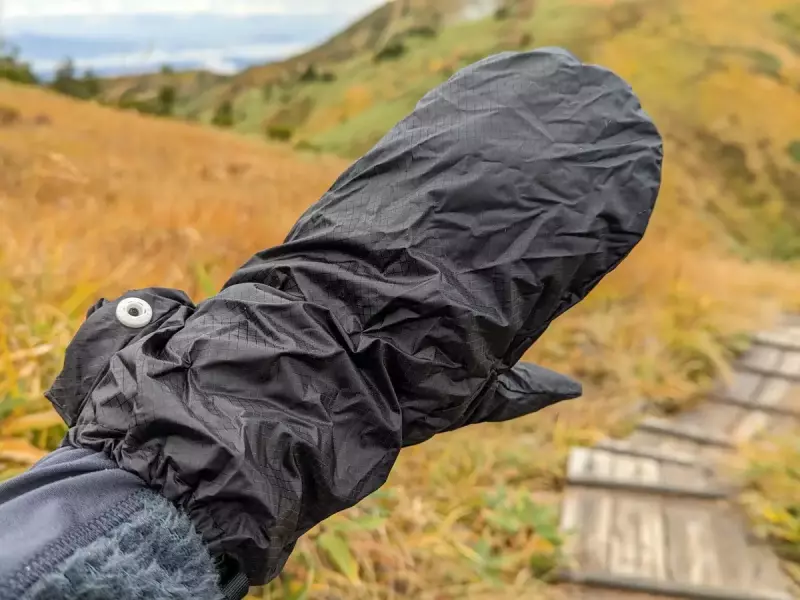 日帰り登山で晴れ予報だったけど、雨が降ってしまった時に山旅防風ミトンをすることで、一時的にレイングローブ代わりに使用することができます。完全防水性ではないので強い雨だと縫製部分から水が浸透してきてしまうのですが、レイングローブがない時はあって良かったと思わせてくれます。