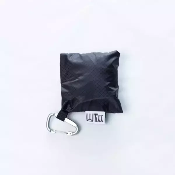パッカブルした後にカナビラを取り付けることができるので、ザックやズボンのベルトループに引っ掛けておくこともできるし、ズボンのポケットやポーチの中に収納しておくこともできます。