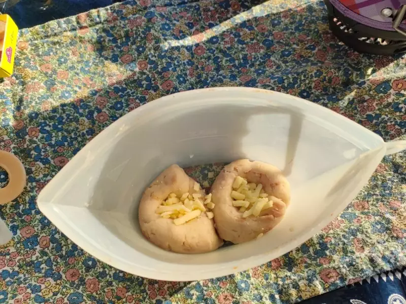 3.こねているうちにシリコーン保存袋のお掃除が出来ました。二つに分けて真ん中をくぼませてチーズを包みます。②の時にベーコンと一緒に混ぜ込んでも美味しいですよ、どちらでもいいです。