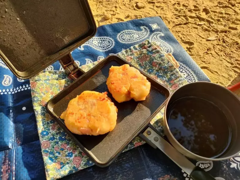4.ホットサンドメーカーの両面を軽く熱したらバターを落とします。そこへ形を整えたタネを置いてフタをし両面を焼きます。バターが焦げやすいので弱めの火にします。焦げては無いけど、余分なバターが焼けて煙が出ることがあります。