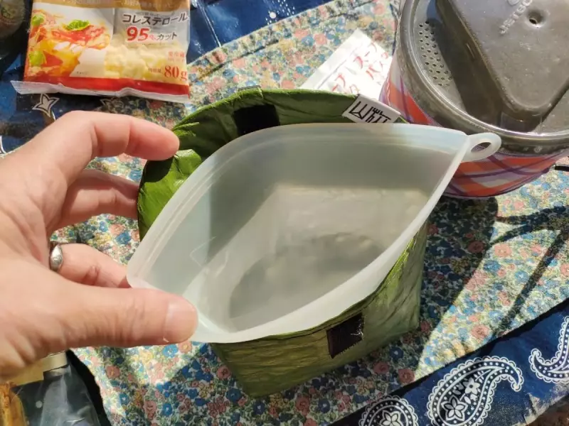 ●調理した熱々の物を注ぐので「ジップロック」ではなく耐熱温度も高く安定性のいい「シリコーン保存袋」を使います。ややオーバーサイズですが食べる時にコジ―の下側をちょっとしぼり気味に持つと全く問題ありません。