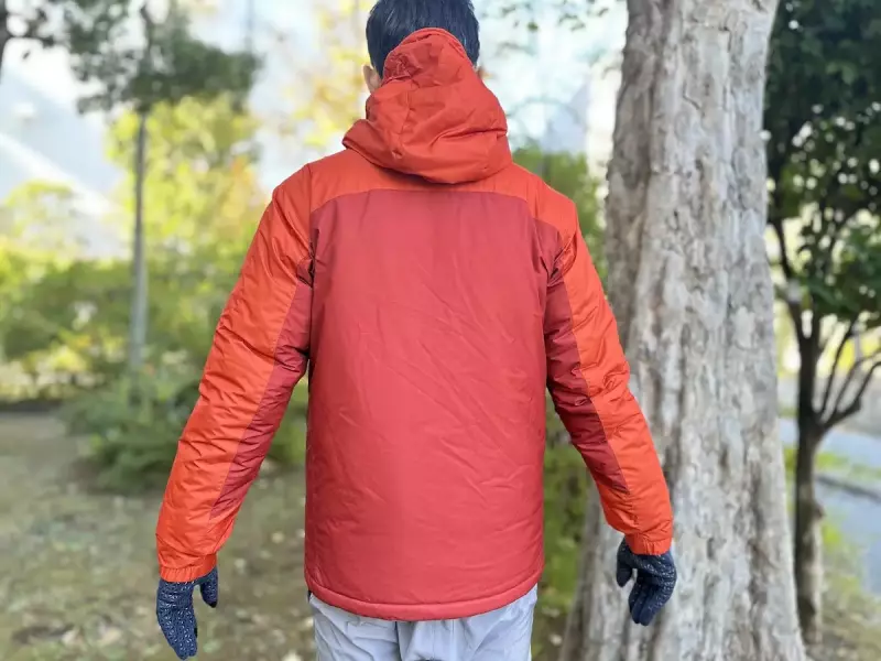 中綿に使用されたエクセロフトは軽量性に優れた「U.L.サーマラップシリーズ」の構造とは異なり、3枚差し構造と言ってシングルキルト構造に、生地をもう1枚加えて冷気の侵入を防いでいます。これによって体から出た暖まった空気を逃さず、また表地から裏地まで縫製糸が貫通していないのでコールドスポットができにくい保温性に優れた構造を採用しています。