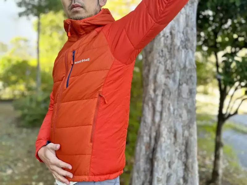 行動着として着用することを前提に考えると、スタッフバッグからの出し入れや、洗濯回数の多さ、ザックやショルダーハーネスなどの圧力などでウェアが酷使されます。それによって中綿がへたってしまうことが懸念されますが、モンベルのオフィシャルサイトでは2000回圧縮しても80%以上の嵩高をキープする試験結果が公開されています。