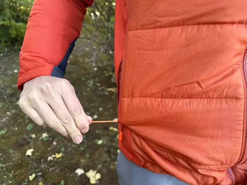 また裾にはドローコードが付いていて、ハンドウォーマーポケットの中にあるドローコードの先端を引っ張ることでフィット感の調整をすることができます。