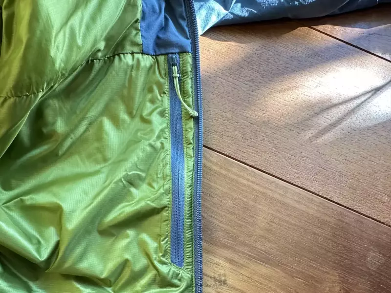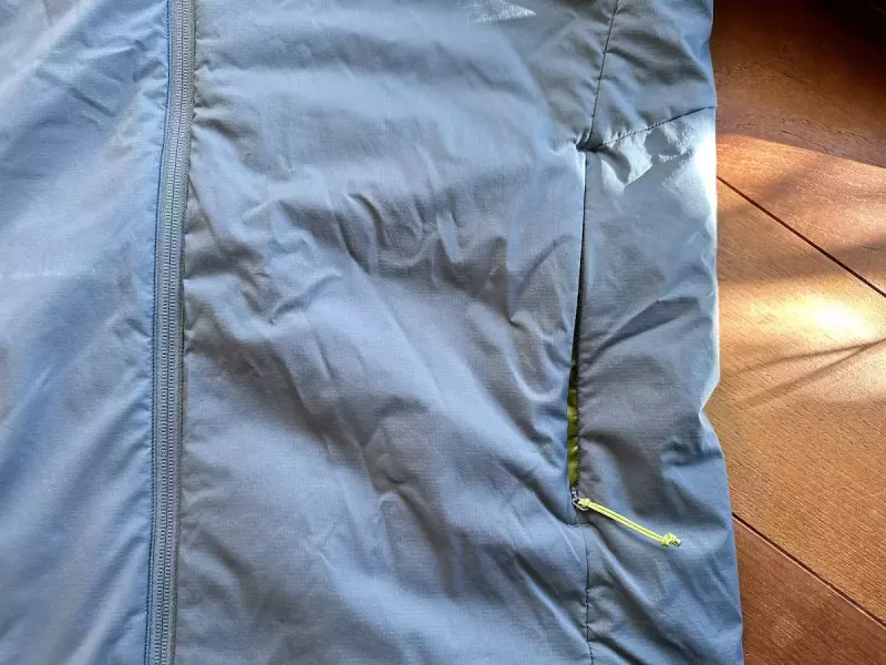 ポケットはジッパー付きのハンドウォーマーポケット、左手側にジッパー付きの内ポケットが備わっています。この内ポケットにパッカブルすることができ収納サイズは素人採寸で20cm×17cm×10cmの大きさになります。