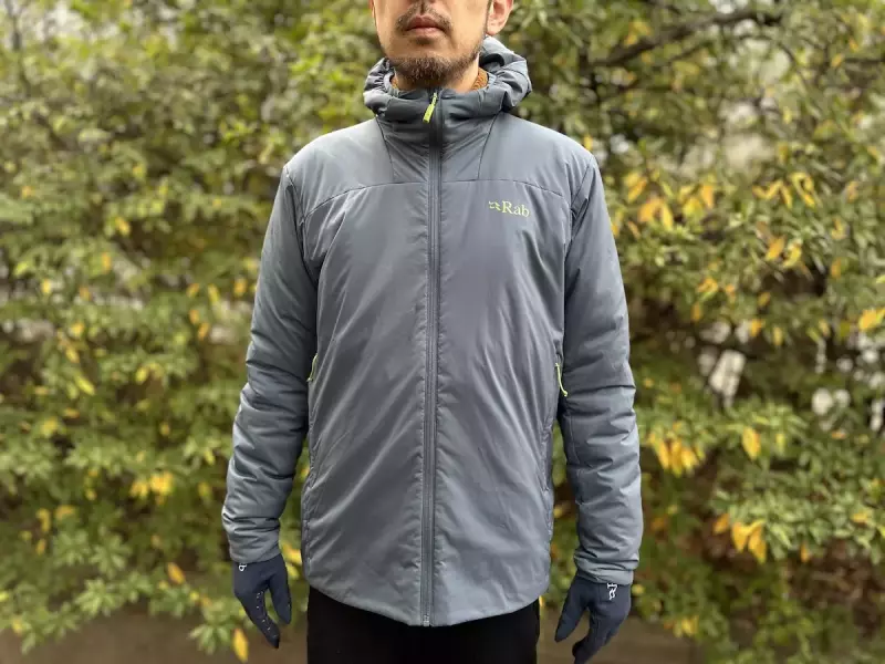 Rabのゼネア アルパイン ライト ジャケットはUKのLサイズ(JPNXLサイズ)で測ってみると319gです。身長180cmの男性が、中に厚手のミドルレイヤーを着用してゆったりとしたサイズ感です。