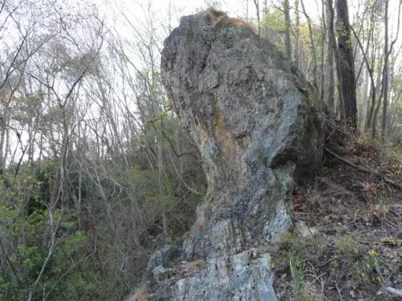 竪破山には奇岩・巨岩信仰があり、登山コース上にはさまざまな奇石、巨石が点在しています。なかでも山頂付近にある太刀割(たちわり)石は、直径7mの巨石がまるで刃物でスパッと切られたかのように真っ二つに割れていることで有名です。