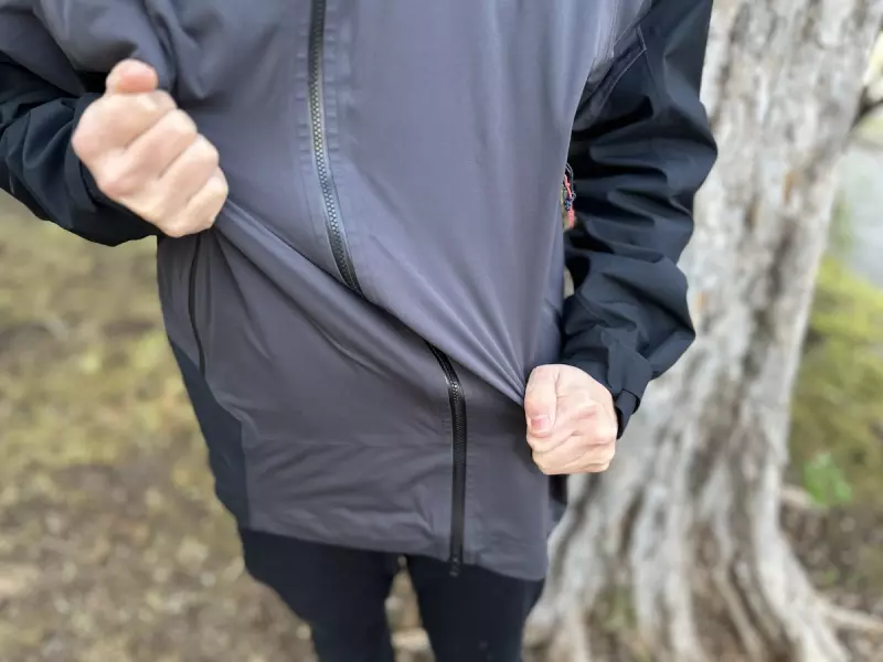 フロントにはダブルジッパーが備えられており、小雨程度の天候時や、キネティックアルパイン2.0ウィンドブレーカーのような使い方をしている時に、フロント部分の通気性を確保するのに非常に便利です。このジッパーは耐水性の高いYKKのアクアガードジッパーで、安心感が高いのですが、少しジッパーが固いです。なので僕はジッパーワックスを塗ってファスナーの滑りを良くしています。