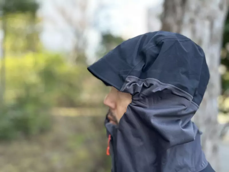 3つのキネティックジャケットの中で唯一ヘルメットの上からフードをかぶることができるデザインを採用しています。フードをかぶっていない状態でも頭にしっかりとフィットするように、後頭部に設けられたドローコードで頭の周囲にフィットし、さらにフードの側面の調整を可能にするドローコードが左右に備えられています。