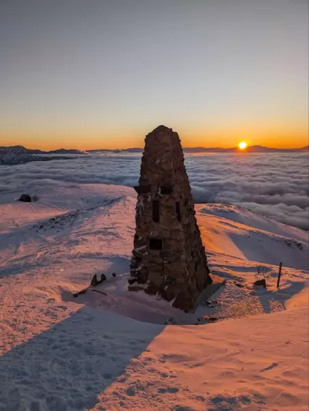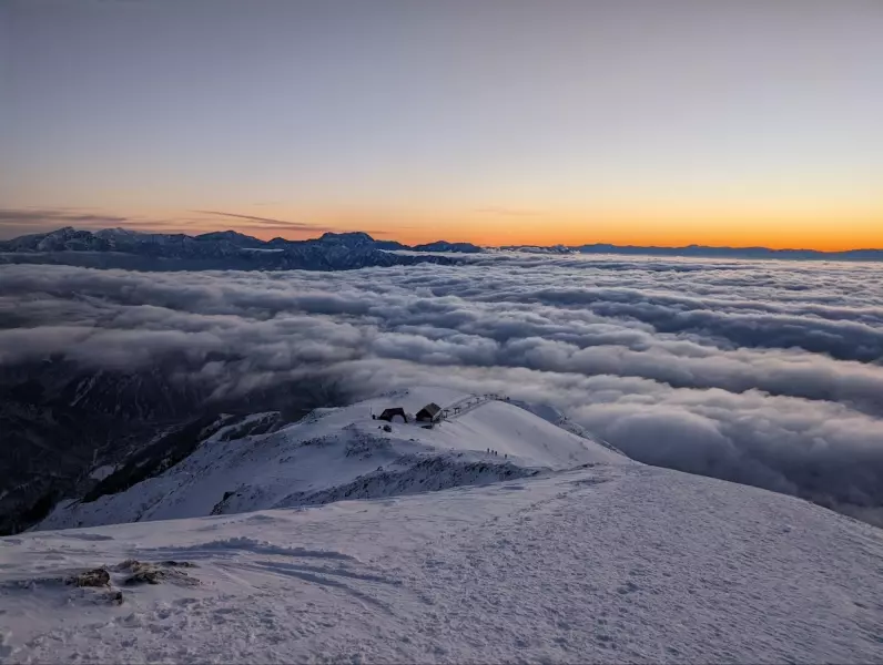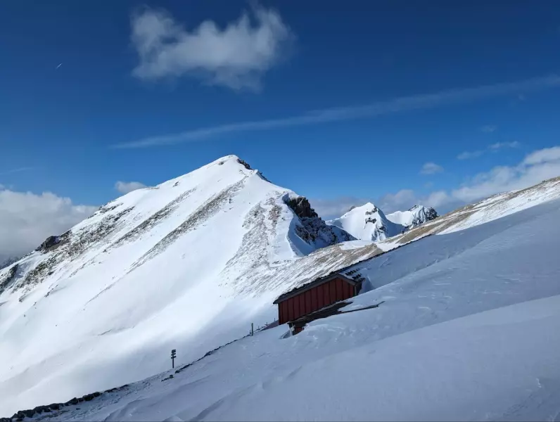 唐松岳頂上山荘が見えてきました。ここは冬季は営業していないのでご注意ください。この日はかなりの快晴でしたが、なぜか山頂に着く手前で強風&ガスガスになってしまいました笑。本来ならば山頂からは劔や立山の姿が見えるそうですが、ろくに写真が撮れず。また夏山にて訪れる楽しみができました。