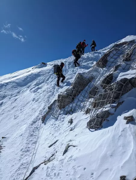 基本的に危険箇所は少ない登山道でしたが、山頂付近は急斜面や道幅が狭いところが出現します。すれ違いが難しいので譲り合って通過。アイゼンとピッケルを刺して足場をしっかりと確認しながら進んでいきます。