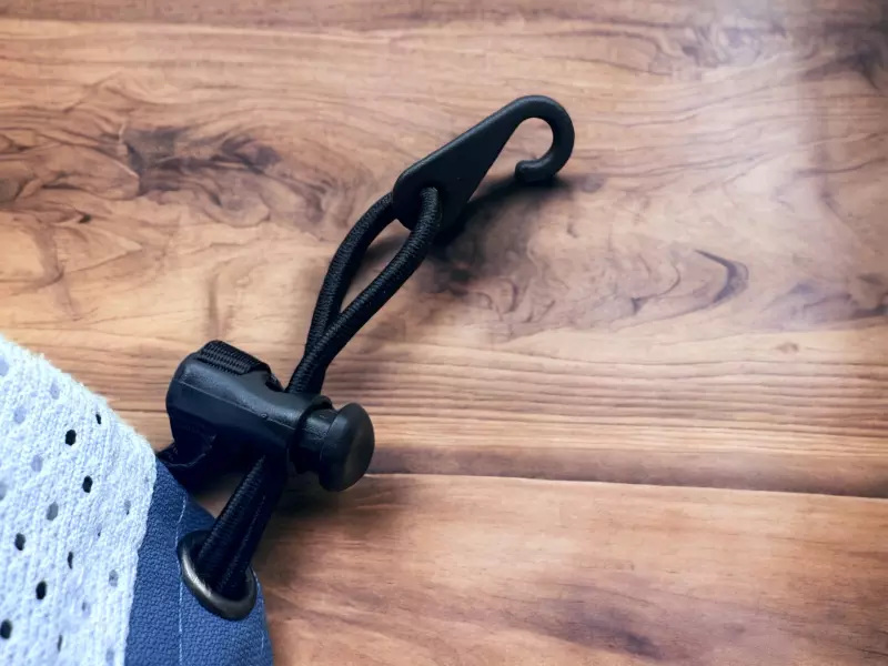 前かがみになった際にボトルの脱落を防止するコードは、片手でボトル上部に引っ掛けることができるように、コードロックの形状やドローコードの直径を調整しています。