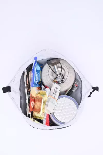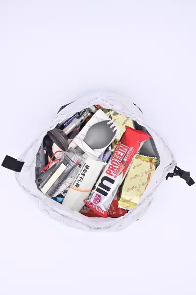 Mサイズの場合はそこから更にガス缶、ガスストーブ、五徳、ライター、エバニューのTi570cup、ヘッドライト、ランタン、カトラリーを収納することができて長期縦走登山用のスタッフバックにお勧めです。