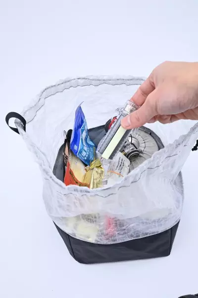 ボトム部分に耐久性と張りがあるX-PACVX07を使用し自立をするスタッフバッグです。中に入れたものを包み込む素材には、柔らかく耐久性を備え、さらに軽量で透明なので中のものを視認しやすいダイニーマを使用しています。