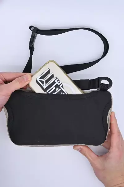 体側に取り付けられたポケットはスマートフォンや紙地図を収納することができるポケットで、体に当たる部分の素材はクッション性と通気性を備えたストレッチ素材で優しく体にフィットします。スマートフォンのバイブが気づきやすいようにデザインされています。