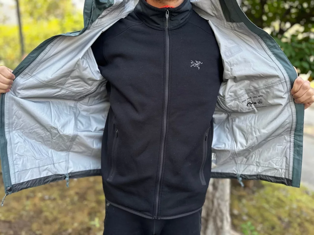 どちらのレインジャケットもメンブレンに表地と裏地を貼り合わせた3層構造です。この3層構造のメリットは、冷たい雨風に叩かれた時に体が冷えづらいこと、また裏地があることで汗をかいた際に肌と接触した箇所がベタつきづらいことが挙げられます。デメリットは3層だから重量が嵩むこと、しなやかさが劣りがちなことが挙げられます。