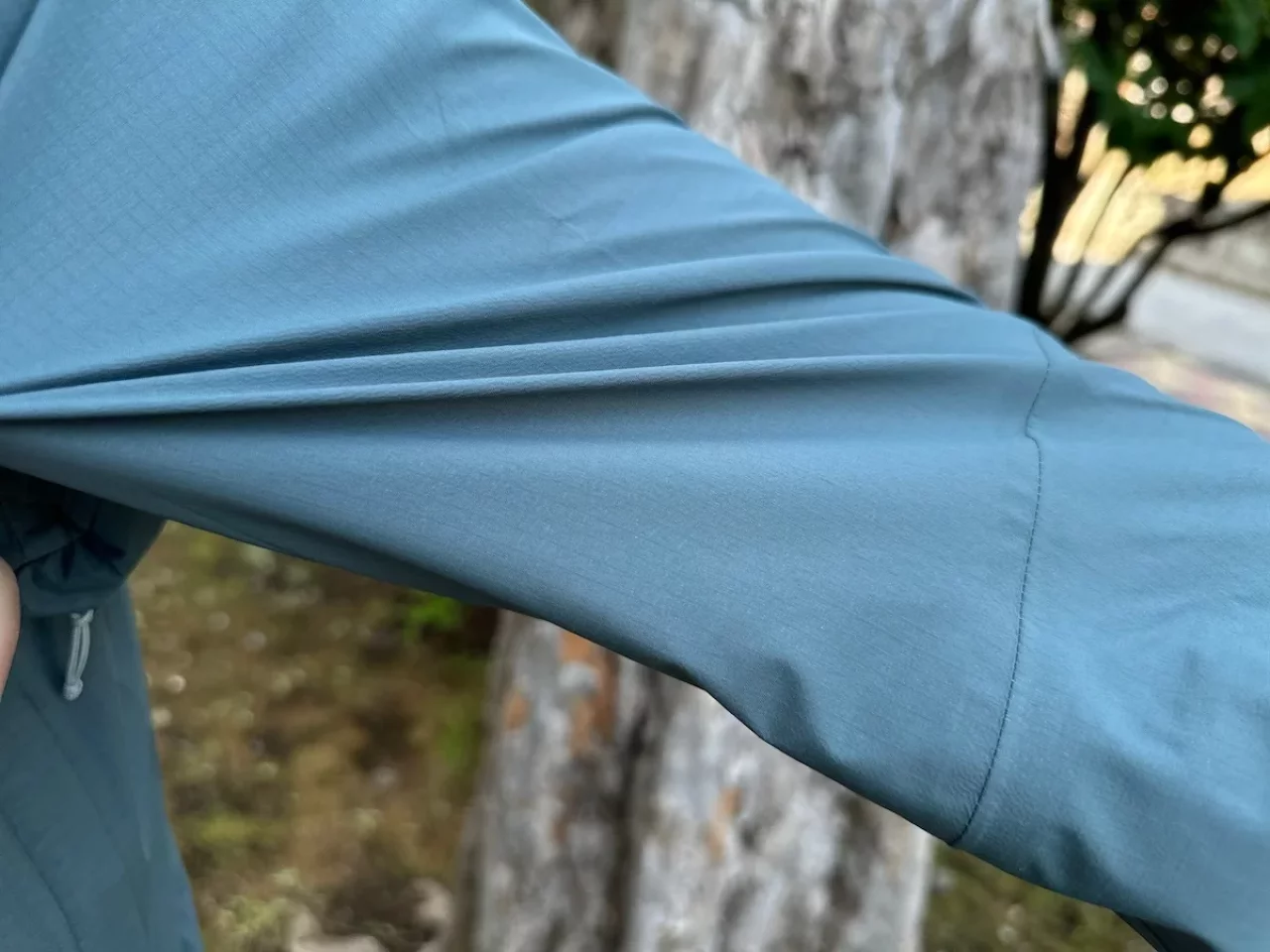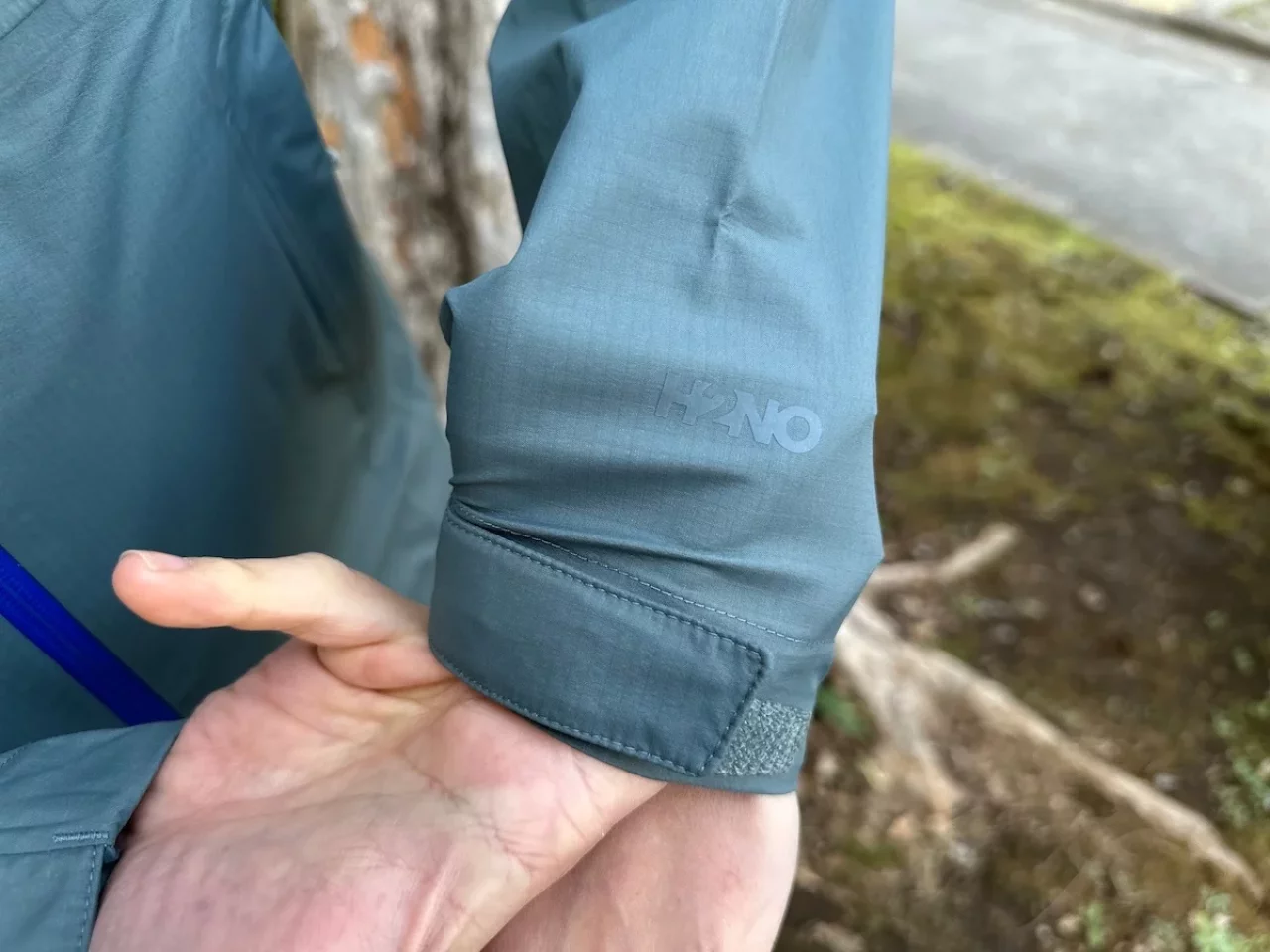 袖口のフィット調整はどちらもベルクロテープのみで行います。裾も袖口にもゴムバンドは設けられていないシンプルな作りです。