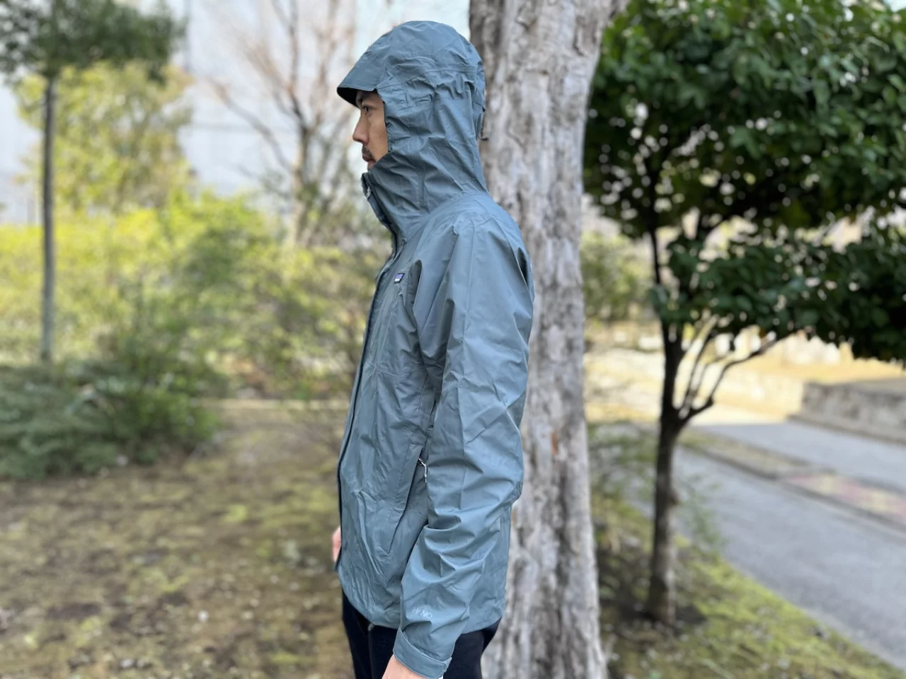 身長180cm、体重65kgの男性が着用してちょうど良いサイズ感ですが、グラナイト・クレスト・レイン・ジャケットのほうが素材がしなやかだからか、少しこちらのモデルの方がゆとりが大きく感じます。