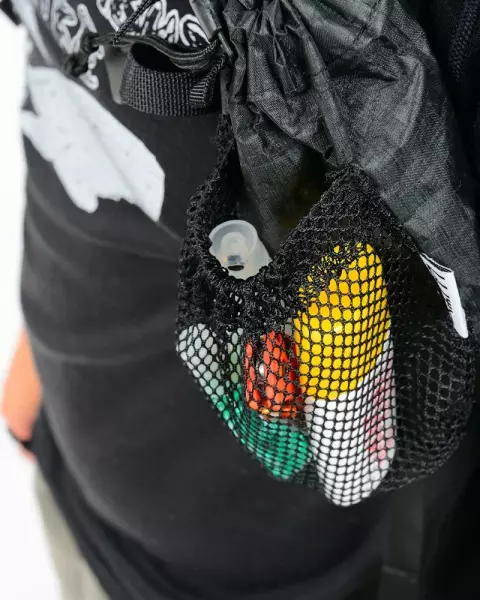 ポケット形状のアイテムです。ザックのショルダーハーネスに取り付けることができるので、水筒だけでなく行動食やコンパクトカメラ、動画撮影機器などを収納することができます。外側にはメッシュポケットが備わっており、メインポケットがパンパンになっても収納力を損なわないようにマチがついています。