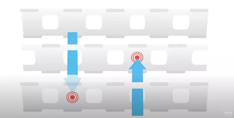 もう一つがエアマットの中の構造です。内部は冷たい地面からの熱がエアマットの表面に上がってこないように、また体からの熱がそのままエアマットの底部に放射されないようにオフセット(いわゆる補正)されるようにデザインされています。通常マット内で熱が自由に移動できてしまうとマット外に放出されてしまうのですが、この構造によって熱をエアマットの中に閉じ込める役割があります。