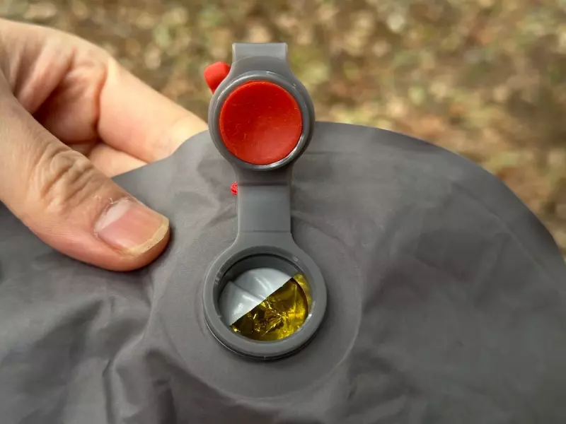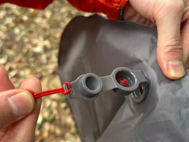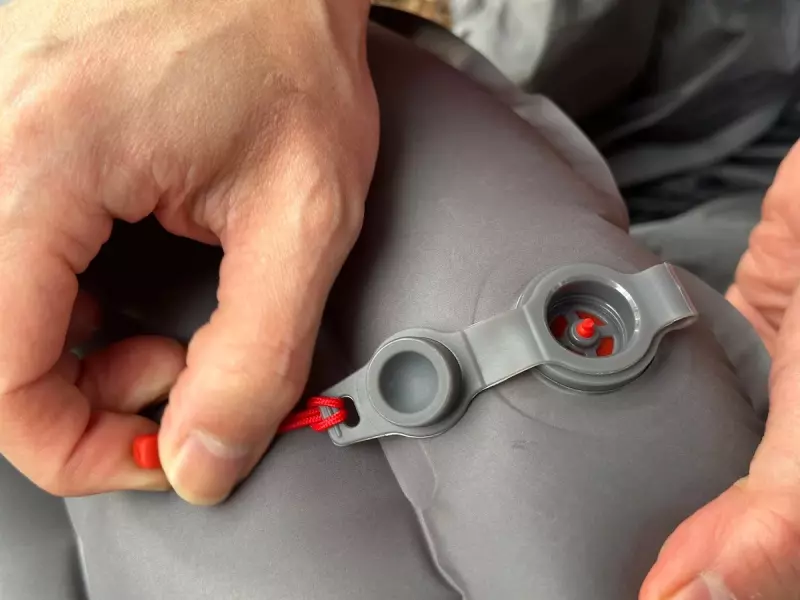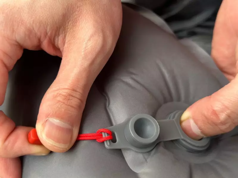 取った後もエアマット側のバルブには弁がついているので勝手に空気が抜けません。エアマットの空気調整はバルブの中心に備えられた赤い突起部分を上から強く押すことで空気が抜けます。これを使ってエアマットの柔らかさを調整することができます。