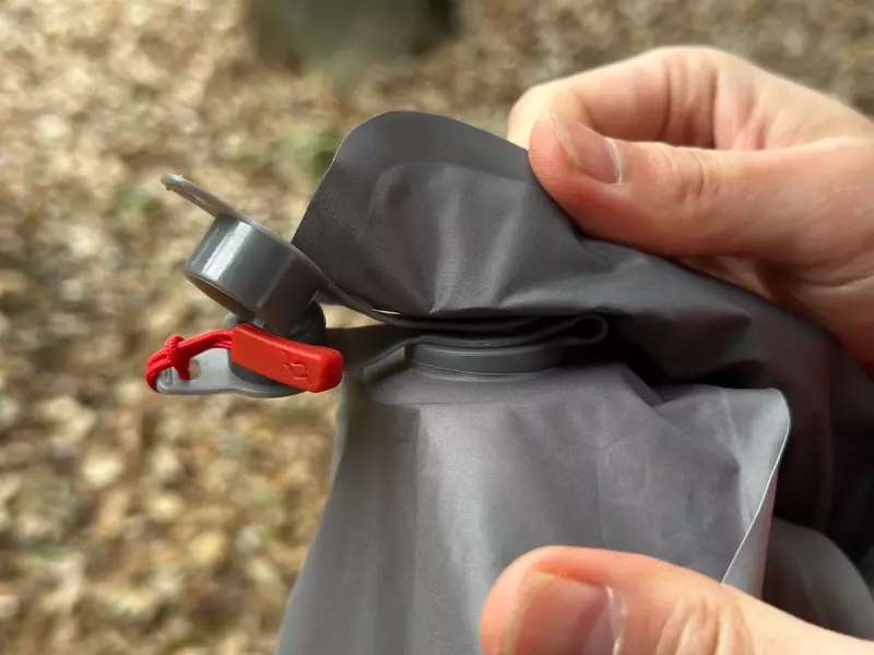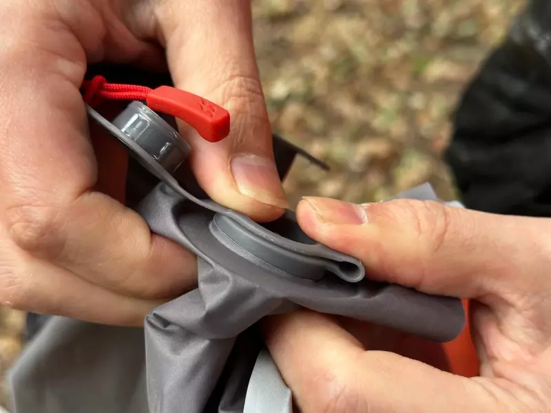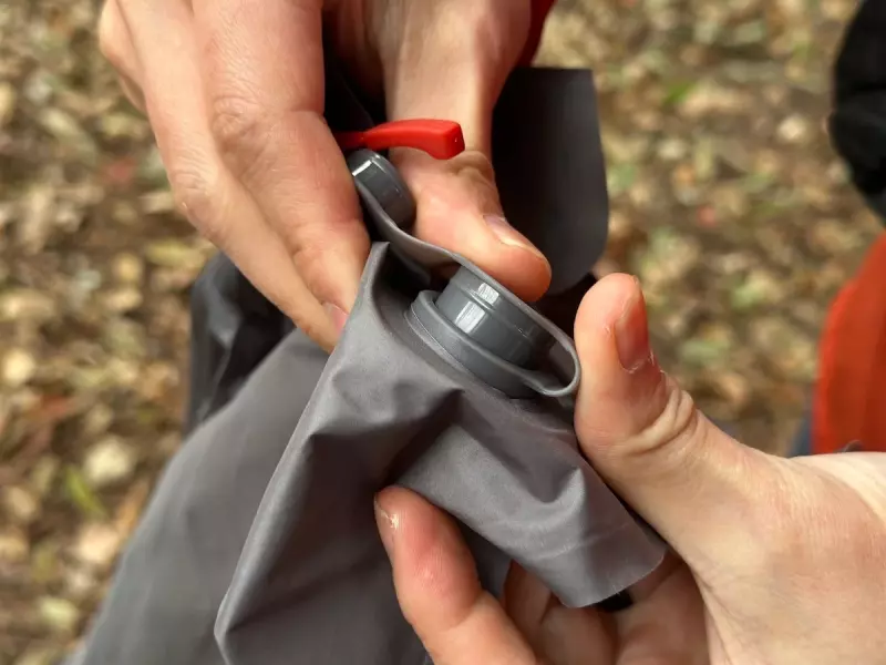 空気を入れる時はエアーマットについたバルブにロールアウェイスタッフサックのバルブを連結させ空気を送り込みます。実際にどれくらいのスピードでマットを膨らますことができるか試してみると、約1分20秒で空気を入れることができました。