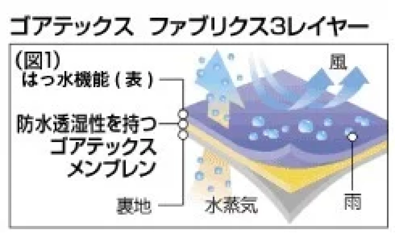 同じゴアテックスのシリーズであっても「2層」「2.5層」「3層」と層数の違う素材があり、それぞれ違った特徴を持ちます。使用する環境や目的に合わせて、最も適した層数の素材が採用されます。