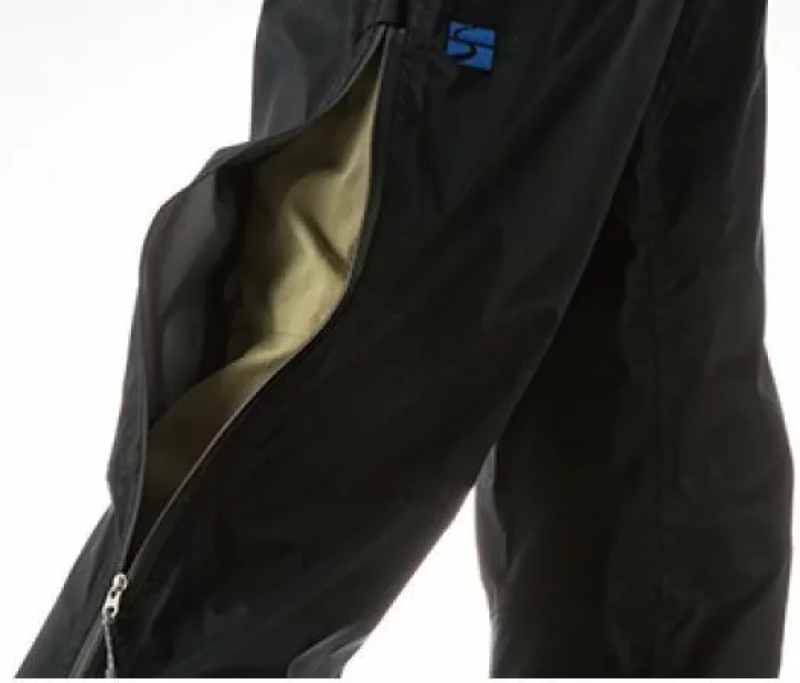 多くのレインパンツには、靴のまま着脱しやすいよう、裾付近にサイドファスナーが付いています。ファスナーの長さは裾から膝、もしくは裾から太腿までと製品ごとに違いがあります。ファスナーが長い方が、レインパンツの内側を汚さずに靴を通しやすくなるでしょう。
