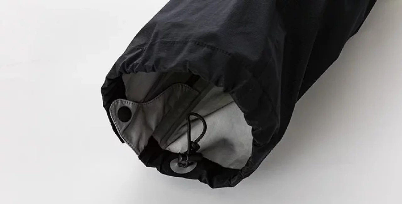裾部分には、裾を絞れるスナップ付きです。ジャストサイズに調整することで、雨の侵入や風によるバタつきを押さえます。