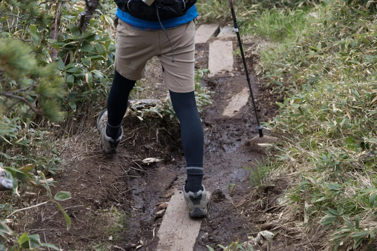 またパンツ丈が短すぎると、靴下が濡れて、靴の中に水が浸みこんできます。登山靴と隙間ができないよう、靴が少し隠れる丈のものを選びましょう。