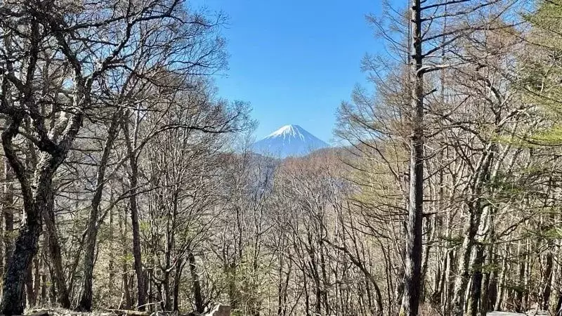 富士見平小屋からは富士山がきれいに見えます。しばらく樹林帯ですが、富士山の神々しい姿と鷹見岩からの絶景もすばらしい。