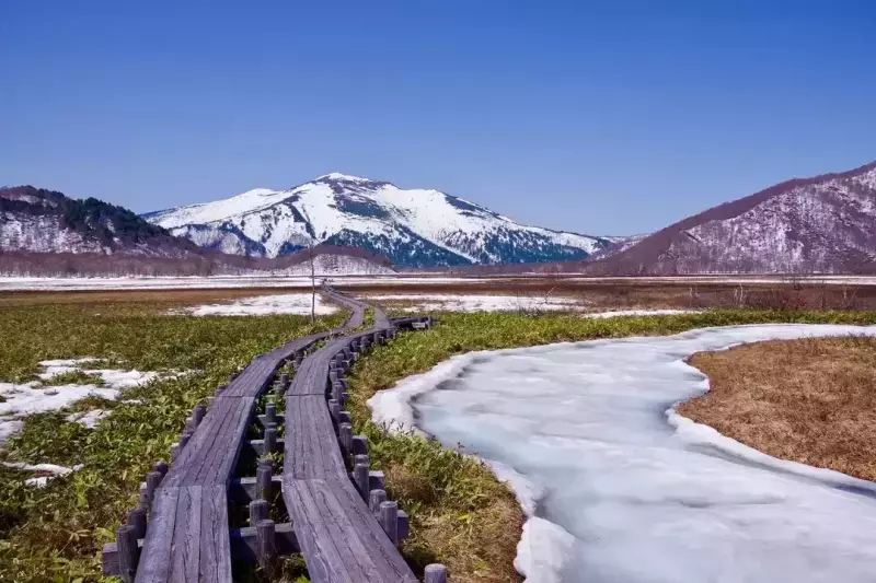この時期も木道の下にはすでにミズバショウが咲き始めています。撮影に夢中になって木道から落ちないように気を付けてください。龍宮小屋からヨッピ橋を渡り尾瀬沼へ。天気が良ければ逆さ燧ケ岳が尾瀬沼に映りこむロケーション。