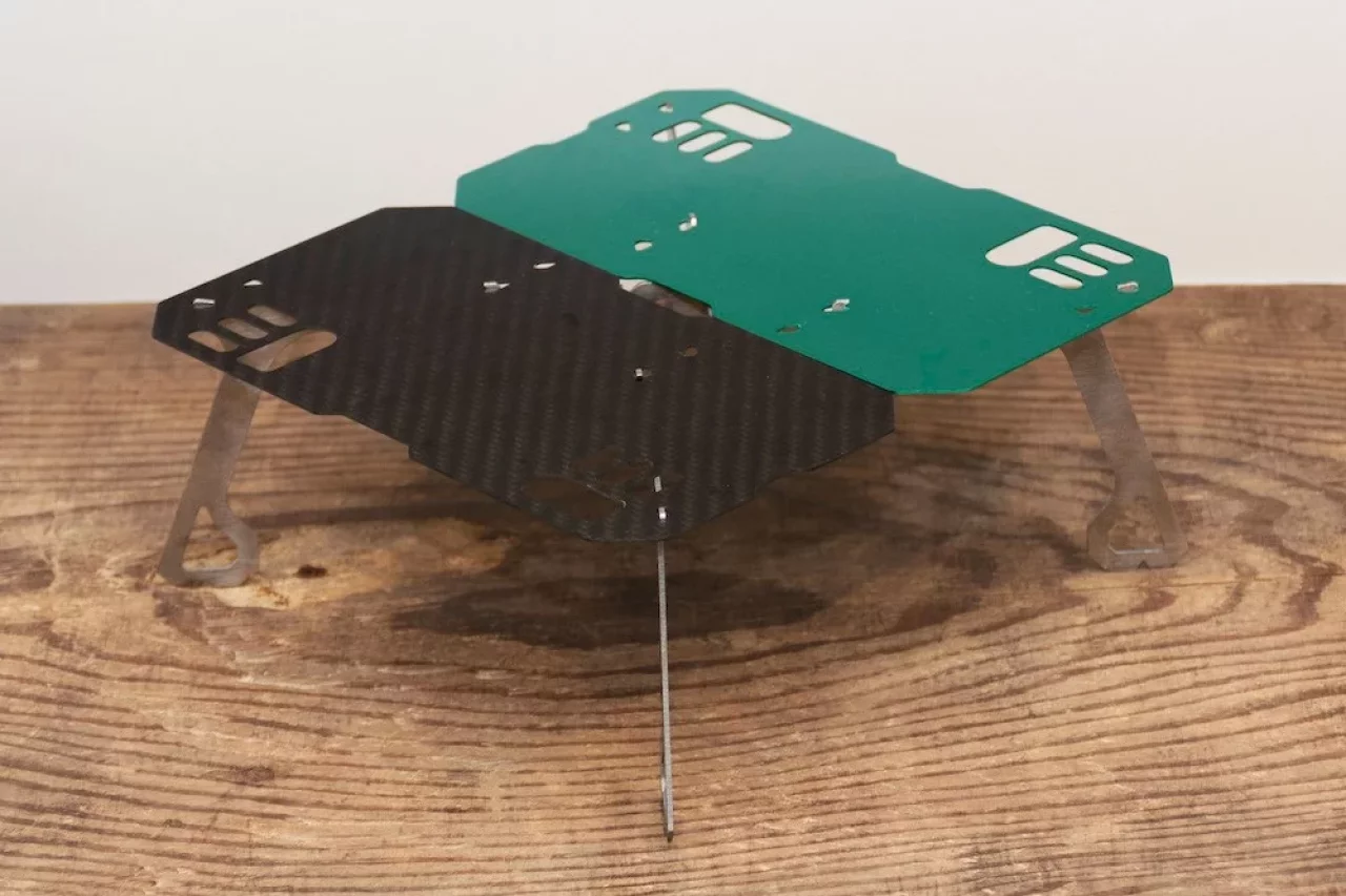 このテーブルの面白いところは二枚で構成した天板を最大で30mm離すことができる点で、片方を調理、もう片方にコップなどを置くといった使い分けが可能なところ。天板を組み合わせることができ、調理もできるアルミと組み合わせたり、熱には弱いが軽量に特化できるカーボンを選択するなど、ユーザーの好みに合わせるといった工夫が魅力です。