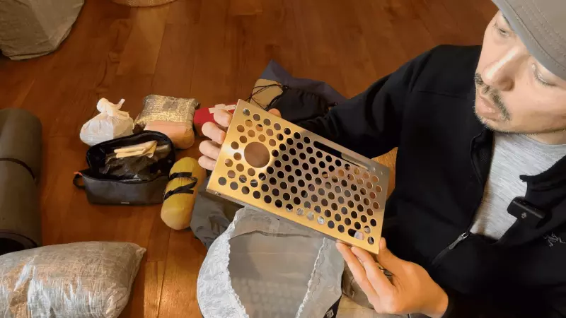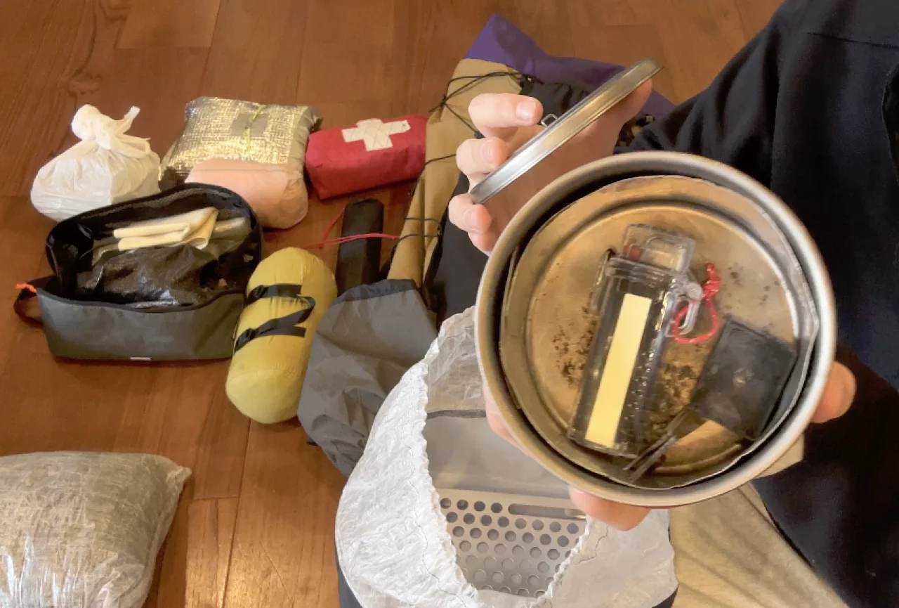 このクッカーの中にお湯を沸かすために使う燃料として、固形燃料を使うため、固形燃料用の五徳、火力が弱くならないように風防、高所でもちゃんと火をつけることができるフリント式のライターと防水ケース。このセットを収納します。