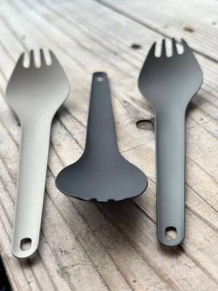 カトラリーは7gという極限の軽さに挑戦した先割れスプーンです。『すくう・からめる』がしやすく食事中にストレスを感じません。アルマイト加工済みのアルミニウム素材で、口当たりが優しく、熱いスープでカトラリーが熱くなることがありません。