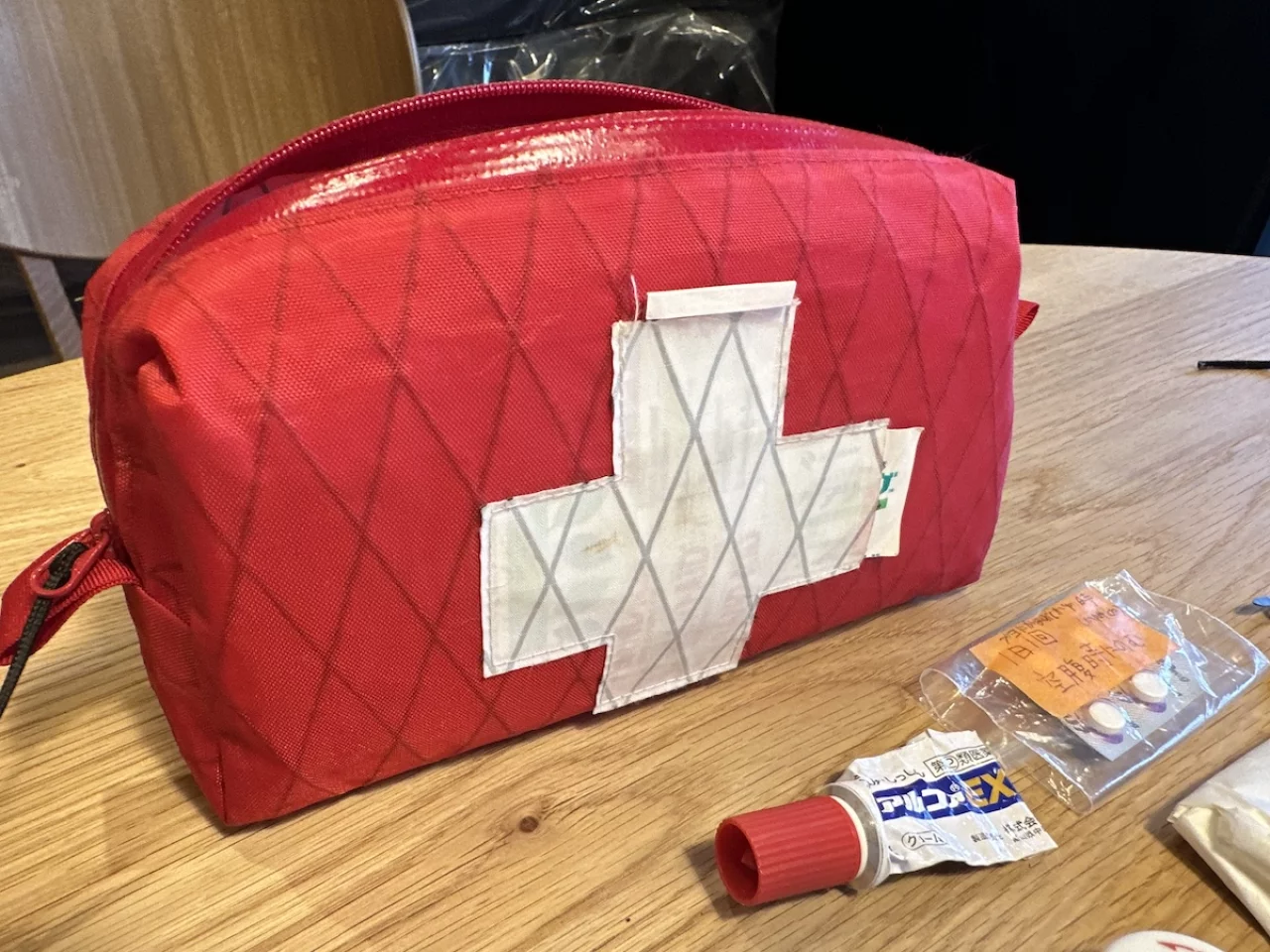 エマージェンシーキットを収納するための気を使っていて、自分自身が動けないときに、他人がザックの中からエマージェンシーキットを取るシーンを考えて、誰でもそれがエマージェンシー用スタッフバックであることがわかる視認性の高い山旅のファーストエイドキットポーチを使用しています。