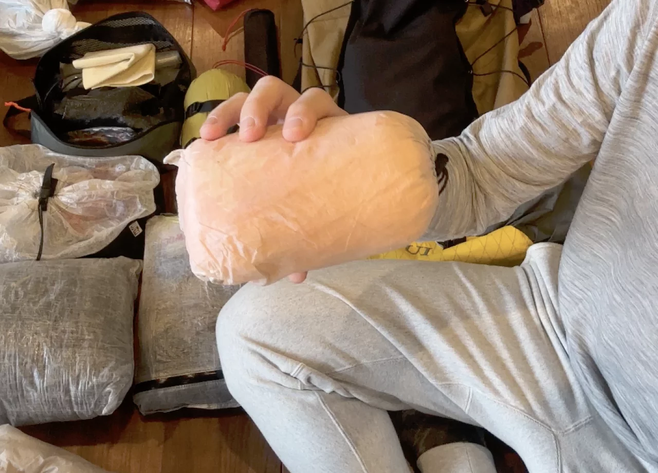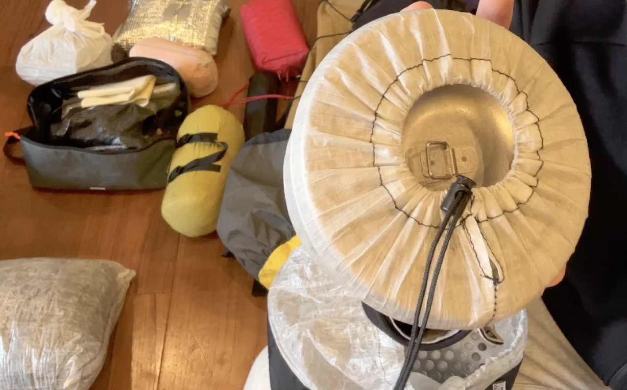 着替えは山旅のダイニーマ製リバーシブルピローに収納して登山装備に加えています。リバーシブルという名前の通り、裏返すと頭を乗せる柔らかな起毛素材が現れます。その中に登山中に着用していた行動着、アンダーウェア、ソックスなどを入れて枕を作ることができます。