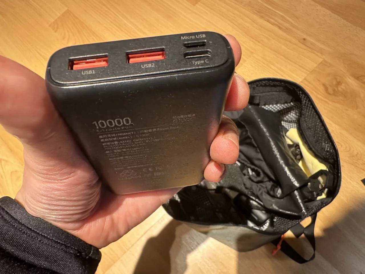 モバイルバッテリーはシリコンパワーの10000mAhを使っています。写真や動画を撮ることが多いので、少し容量が多いバッテリーを選んでいます。シリコンパワーはアンカーと比較しても安く、また様々な規格のUSBを尽きるのでお勧めです。