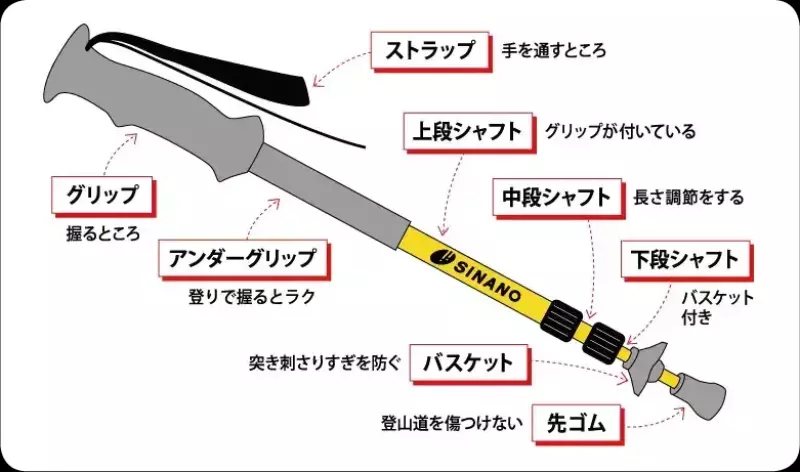 使用時以外は、ザックの中に収納しましょう。両手を使う鎖場でも長いままぶら下げていると危険です。必ず収納しましょう。