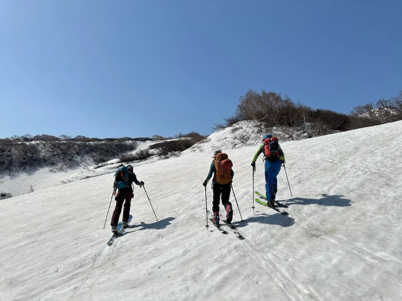 七高山に到着したら外輪を通って東面側に移動。移動したら滑走モードに切り替えます。広く雄大な斜面をシャリシャリと音をさせながら滑る気持ち良さは春のスキーならではです。