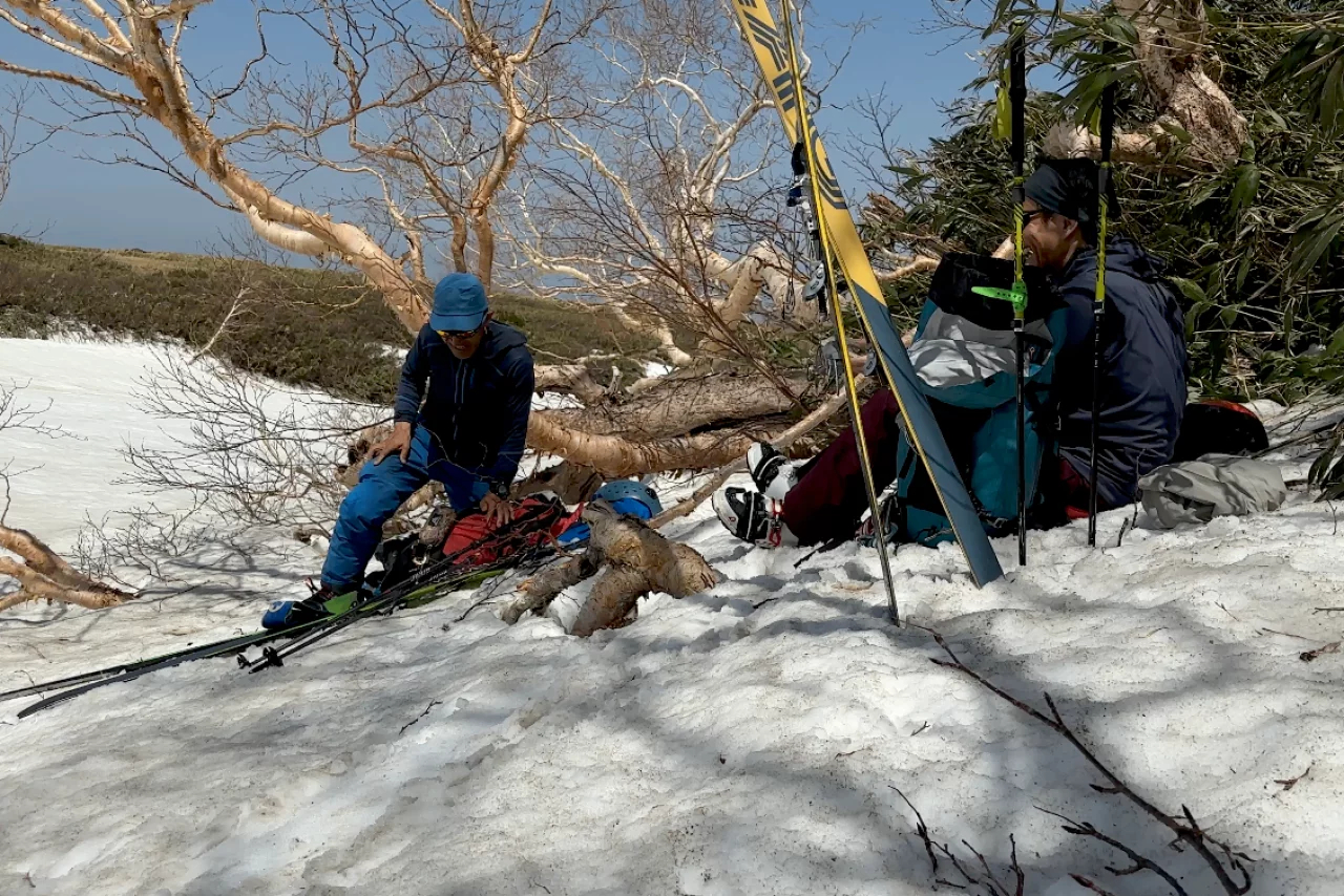 ボトム付近まで最高のスキーを楽しんだあとは、薮こぎをしながら矢島口(やじまぐち)へと戻ります。薮の濃さと、スキー板を担いでいるという状態、またプラスチックブーツで歩かなければいけないという三重苦でアドベンチャー感半端ない下山となりましたが、最終的にはこの藪こぎさえも喜びと変わるような素晴らしいツアーを楽しむことができました。
