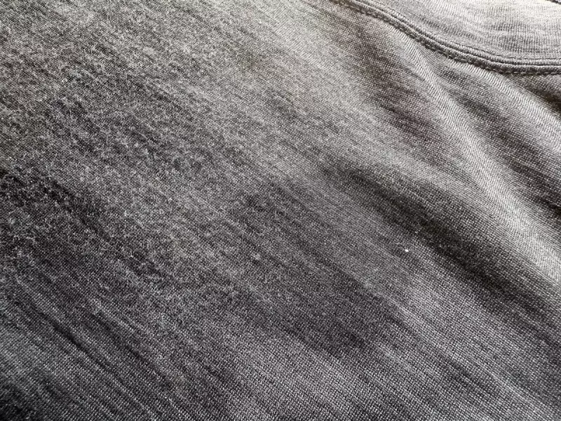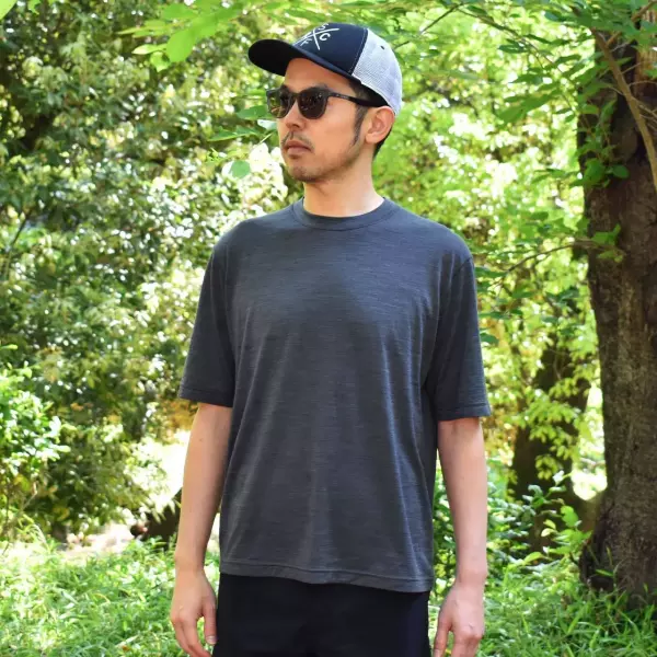 メリノウールとポリエステルが50%づつ混紡されているTシャツ全てがこのように両立した機能を備えているかと言ったらそうではありません。繊維の質感、糸の太さ、染料、製品染めか否か、染める時に使っている水の質(日本、中国、その他国で大きく異なることを実証済み)などで機能性は大きく異なります。
