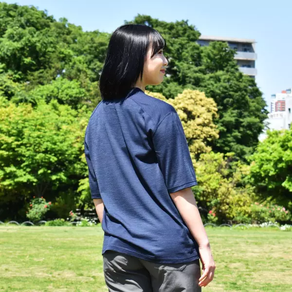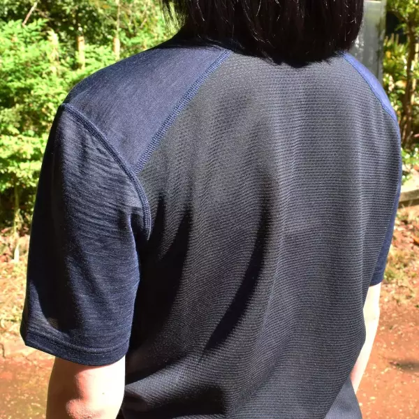 そして2種類のモデルにおいては、今お話ししたレギュラーフィットとリラックスフィットのスタンダードなTシャツ以外に、レギュラーフィットを採用した背中全体と脇部分にメリノウール50%、ポリエステル47%、ポリウレタン3%のメッシュを備えたモデルが存在します。