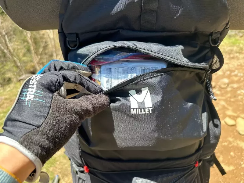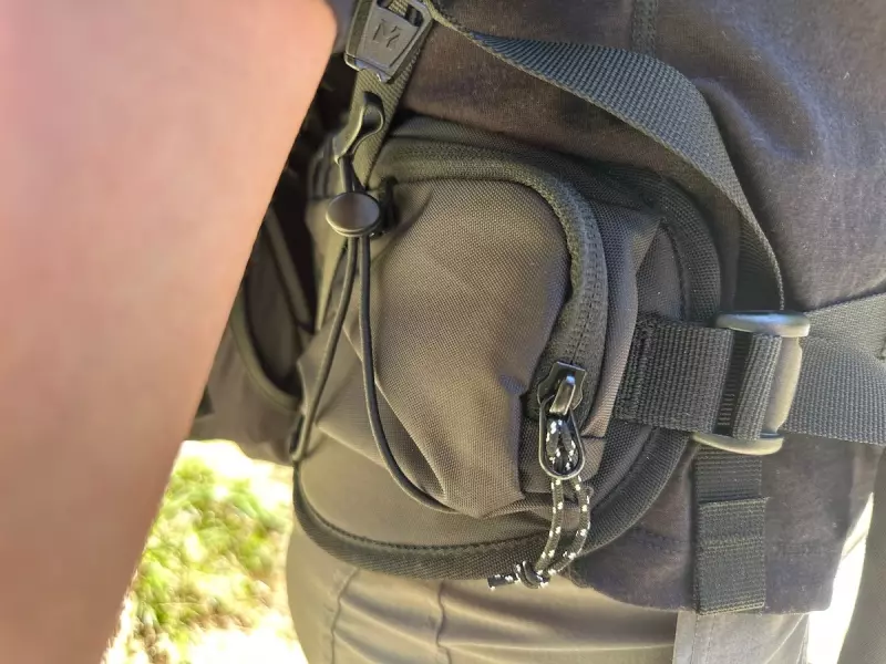 まずはじめにフロントポケットはジャックの上部にマチ付きのジッパーポケットが備わっています高さは約16cmほどで、決して高いとは言えませんが、マチがついているので容量は結構あります。ただしフロントポケットに重いものを入れると安定した歩きを損ねてしまうので、軽量なウィンドブレーカーや地図、その日に食す行動食などを入れておくのに便利です。