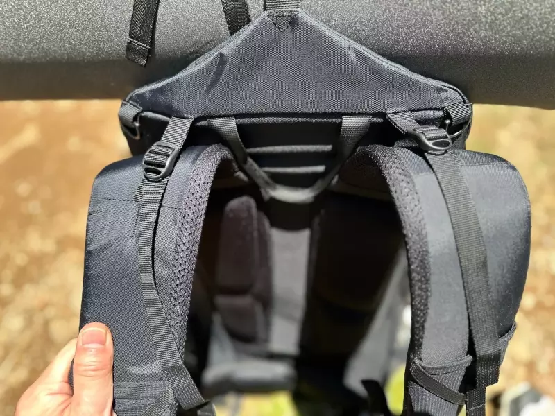 雨蓋はついておらずシンプルな作りなのは個人的に好きな点です。ザックの中に装備を詰め込んだら上部のストラップをバンジーコードの好きな位置に引っ掛けて固定をします。残念なポイントとしてはこのバンジーコードに引っ掛けるプラスチックハードウェアがバンジーコードに引っ掛けづらいデザインで、ここは少し改良して欲しいなと思いました。
